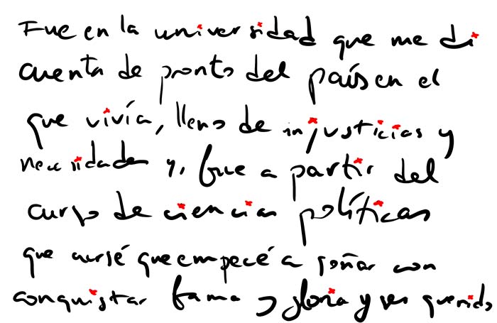Fue en la universidad que me di cuenta de pronto del país en el que vivía, lleno de injusticias y necesidades y, fue a partir del curso de ciencias políticas que cursé que, empecé a soñar con conquistar fama y gloria y ser querido por mi pueblo. Pues yo sentía que había hecho política toda mi vida, que fui un rebelde en el colegio cuando abusaron de mí y que expresaba cierta tendencia a desafiar a la autoridad. Pero, no sería sino después de los años, la madurez y los consecutivos fracasos que borré definitivamente la ambición de acumular poder y fortuna; pero, sin embargo, quedaron esas añoranzas románticas de conquistar fama y gloria, incluso a costa de mi propia felicidad.